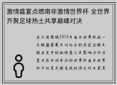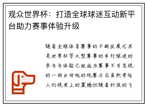 在全球文化的多元交融中,圣诞节与世界杯作为两个具有巨大影响力的庆典,成功地吸引了世界各地球迷与民众的目光。当这两者结合时,不仅仅是一次简单的节庆重叠,更是一个充满激情与欢乐的时刻,为全球球迷带来了一场前所未有的视觉与精神盛宴。本文将从四个方面详细阐述圣诞节与世界杯完美结合的庆典盛宴,探索这一全球性事件如何将节日的温暖与体育的激情融合成一场全球性庆典。首先,本文将讨论圣诞节与世界杯的文化融合,其次是...